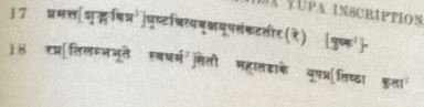 Ll. 7-8 having offered on the sacrificial ground in Agnivaiśvānara fires, Brāhmaṇas (by caste), Vasōr=dhārā oblation series,[3] magical as it were, (as it produces the satisfaction of) the stream of all desires,[4] Ll. 14-16 a fee of several hundreds of thousands of cows (was offered) by [Śrī ?]sōma, the leader of the Sōgis, son of Jayasōma, grandson of Prabhāgra(?)vardhana, dancer at victory, born in Mālava stock, as famous as the royal stock of the Ikshvākus, Ll. 12-14 (king [Śrī ?] sōma), who was experiencing (i.e., having), on account of the extent of his excellent qualities, genuine human qualities in no way different form (i.e. inferior to) (those of) Manu. Ll. 9-12 who had formed a continuous (i.e., standing) resolution to follow the footsteps of the ancient royal sages in connection with the full protection of his subjects, the (construction of) white (i.e., splendid) assembly halls and rest-houses, (the digging of) wells and tanks, (the erection of) temples, (the grant of) gifts at sacrifices, and (the telling of) truth, and who had thus left no room for sin, Ll. 8-9 (and) who had given space (i.e., building sites or lands) to the temples (literally, establishments) of Brahmā, Indra, Prajāpati, the great sages and Vishṇu. Ll. 16-18 The (stone) yūpa pillar (was erected at the end of the sacrificial session) in the great tank, which is a landmark of Dharma,[5] which is (as it were) a censure (i.e., a rival) of Pushkara (lake) and the bank of which is full of yūpas of holy trees against which bulls with full youthful vigour scratch their horns. _______________________________________________
