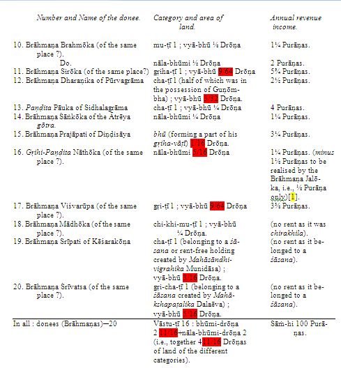 _______________________________________________ [1] In the editors’ translation, Jalōka has been made a donee ; but this is impossible in view of no mentions of a piece of land in his connection and also of the total amount of the donees’ revenue income quoted in line 32. If Jalōka’s amount is counted, the total will be more than 100 Purāṇas even without considering the amount lost in line 24. | |||||||||||||||||||||||||||||||||||||||||||||||||||||||||||||||||||||||||||||||||||||||||||||||||||||||||||||||||||||
