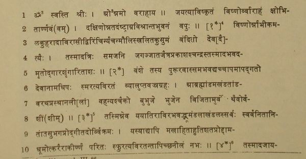 TEXT[2] [Metres : verses 1, 11, 13, 24, 29, 31, 32, 35-37 Anushṭubh ; verse 2 Mandākrāntā ; verses 3, 4, 12, 15-18, 22, 27, 30 Śārdūlavikrīḍita ; verses 5, 8, 20, 21, 23, 34 Vasantatilakā ; verse 6 Śikhariṇī ; verses 7, 9, 10, 25, 26, 28 Sragdharā ; verse 14 Āryā ; verse 19 Pṛithvī ; verse 33 Śālinī.] First Plate