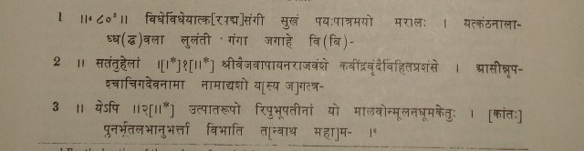 In line 48, we have trivaṭīyāṁ (for trivaṭīyāyāṁ or trivaṭyām) which appears to be derived from Sanskrit tri-vartman and may mean ‘near a place where three roads meet’. Or, like Pañchavaṭī, Trivaṭī may be the name of a place where there was a group of three banyan trees. Ēkahala-halaikasya(ºhālikasya?) probably means ‘of the farmer possessing only one plough’. In Bhāṁbhibūṭīyā (line 50), būṭīyā is a Gujarātī word meaning ‘a knoll or small mound’. Bhāṁbhī may have been its local name.[2] TEXT[3] [Metres : Verses 1-4,9,11-12,22 Upajāti ; verses 5-8, 17-21 Rathōddhatā ; verse 10 Indravajrā ; verses 13-14 Āryā ; verses 15-16, 25-27 Vasantatilakā ; verses 23-24 Śārdūlavikrīḍita.] First Plate