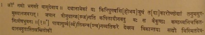 Then we have the mention of the poet and the writer (vv. 46-48) ; and the next verse expresses the hope that the king may protect the earth, may the laws of the three Vēdas prosper and may the cows and the twice-born (dvijas) obtain happiness. This account is followed by the particulars of the date and the name of the engraver, as seen above ; and the inscription comes to an end with the name of Vināyakapāladēva who had annihilated the enemies,[2] and finally with a salutation to the glorious Vāsudēva and the Sun. Of the geographical names mentioned in the present inscription, Kālañjara (vv. 31 and 45) is the well-known fort of that name in the Bāndā District of Uttar Pradesh and situated about 145 Kms. west-southwest of Allahabad. Mālavanadī, on the bank of which Bhāsvat, i.e., Bhilsā (now known as Vidishā) is situated (v. 45), is the river Bētwā ; and Gōpa-giri (v. 45) is of course Gwālior, the Chief city of the distrcit of that name in Madhya Pradesh. The other places mentioned in the record in v. 45 have already been identified above. TEXT[3] [Metres : Verses 1, 5-6 and 24 Śikhariṇī; vv. 2-4, 7-8, 10-11, 17, 19, 25, 28, 30, 32, 35, 38-40, and 44-45 Śārdūlavikrīḍita; vv. 9 and 29 Mandākrāntā; vv. 12 and 15 Upajāti ; vv 13, -18, 22, 33, 37, 41 and 46-47 Vasantatilakā; vv. 14, 48 and 54 Āryā; vv. 16, 21, 34 and 49 Anushṭubh; vv. 20, 23, 26-27, 31, 36, and 42-43 Sragdhara].
