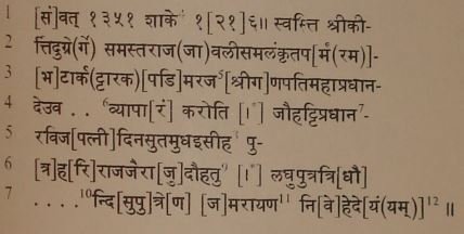 SUPPLEMENTARY INSCRIPTIONS we have already seen above, while identifying place-names in No. 179. For we have no evidence to show that the Yajvapālas in their last days succeeded in extending their dominions so far as to include Dēogaḍh in the Jhansi District which was under the Chandellas. The second half of the inscription (ll. 4-7) is more corrupt and also fragmentary ; but as reconstructed by Sircar, it seems to introduce the Pradhān Ravija of Jatuhaṭṭa, his son Mudhaïsīha, and the latter’s two sons, Harirāja and Jayarāja, both of whom lost their lives in a battle with an unspecified enemy, and also that the pillar was erected in memory of their death, by Jayarāja’s son, Yamarāja. Here the word used is nirvahita.[1] As already observed by Sircar, the name of Ravija’s wife and that of the mother of Yamarāja cannot be fully deciphered, because of the mutilated condition of the record. Of the geographical names appearing in the inscription. Kīrtidurga is more possibly Chandērī rather than Dēogaḍh with which we have identified above ;[2] and Jauhaṭṭa (Sans. Jatuhaṭṭa) appears to be a locality in the vicinity of Budhērā where the pillar was found.